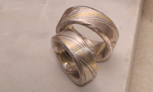 Japanische Schmiedetechnik aus dem 16 Jahrhundert Das Ausgangsmaterial, mehrere Streifen in Silber und Platin und einer in Feingold. Diese werden als Stapel mit Schraubenzwingen zusammengehalten. In der Mitte befindet sich das Gold, auf beiden Seiten wechseln sich Platin- und Silberstreifen ab. Anschliessend werden die zusammengepressten Plättchen bis knapp unter dem Schmelzpunkt erhitzt. Sie verbinden sich […]